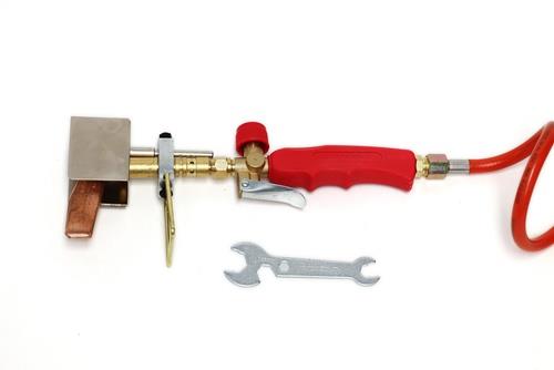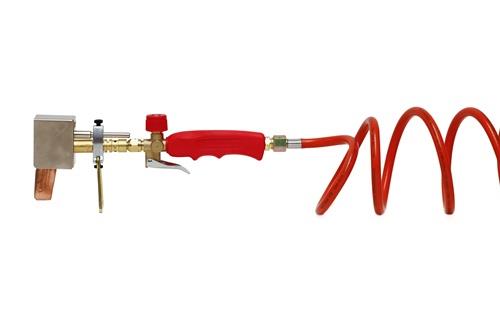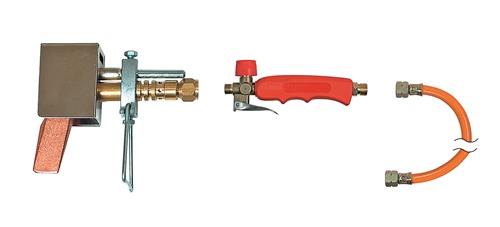 Lieferumfang: Handgriff mit Dreiwegeventil und fixierter Pilotflamme, Hochleistungsbrenner, Lötkolbenhalter, Windschutz, Kupferstück flach (250 g), 2m Schlauchleitung (2x G 3/8“)