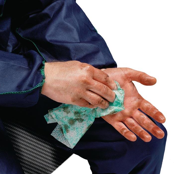 - feuchte Handreinigungstücher in mobilem Spender mit Einzeltuchentnahme