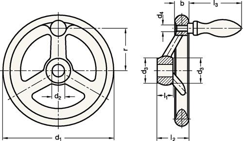 - Handräder DIN 950 werden in der Gusseisen-Ausführung mit Ballengriffen aus Stahl versehen