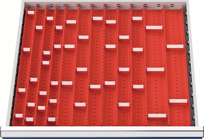 Produktinformationen "Muldeneinsatzset Fronthöhe 50 - 75 mm für Schrankbreite 600 mm 16 Einsätze mit 40 Trennwänden"
